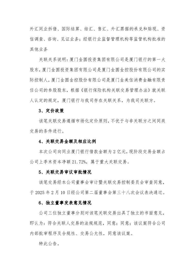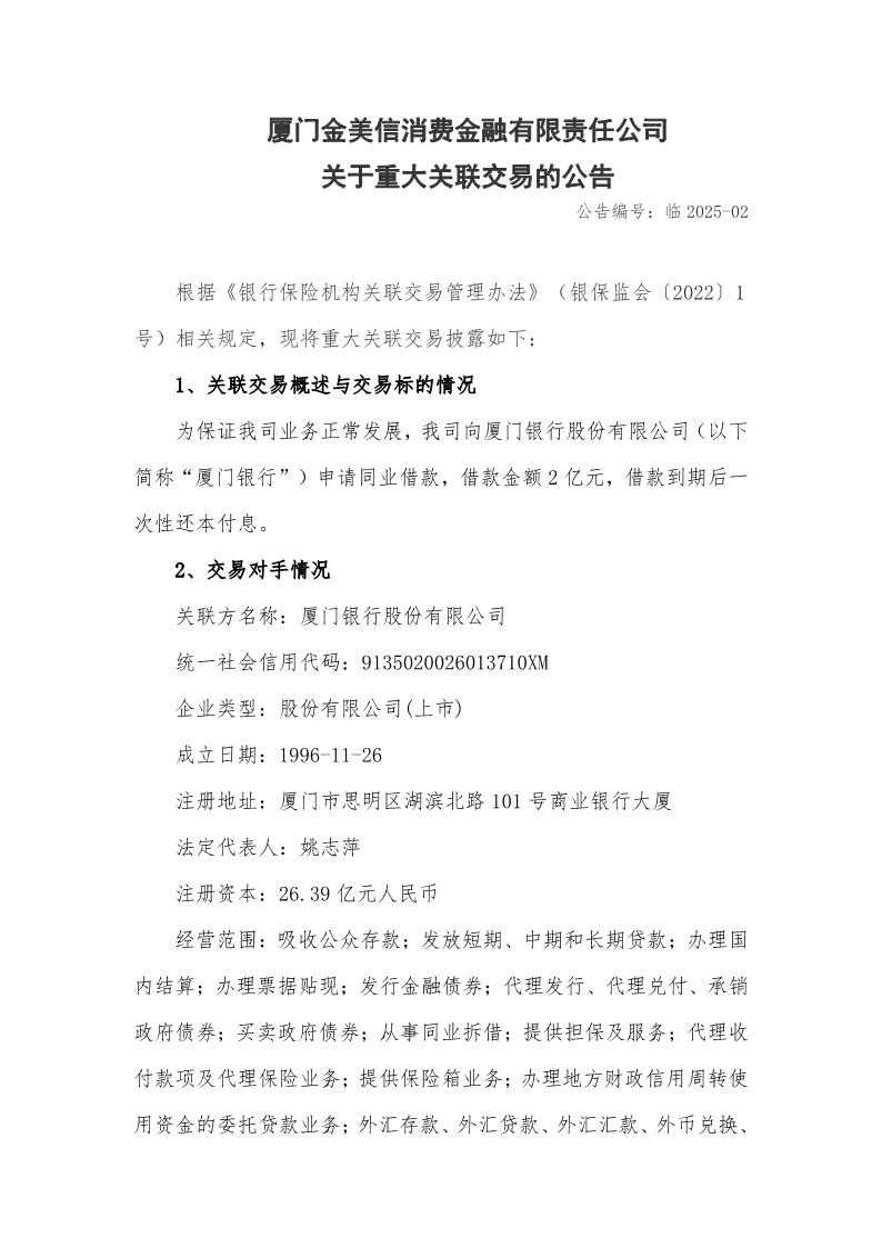 厦门金美信消费金融有限责任公司关于重大关联交易的公告